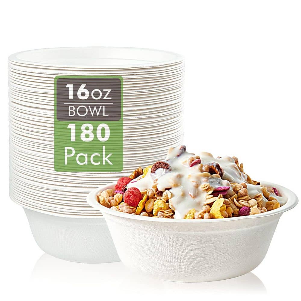 16 fl. oz. White Paper Disposable Bowls, Eco-Friendly Bagasse Compostable Bowls for Snacks and Salads (Set of 180)