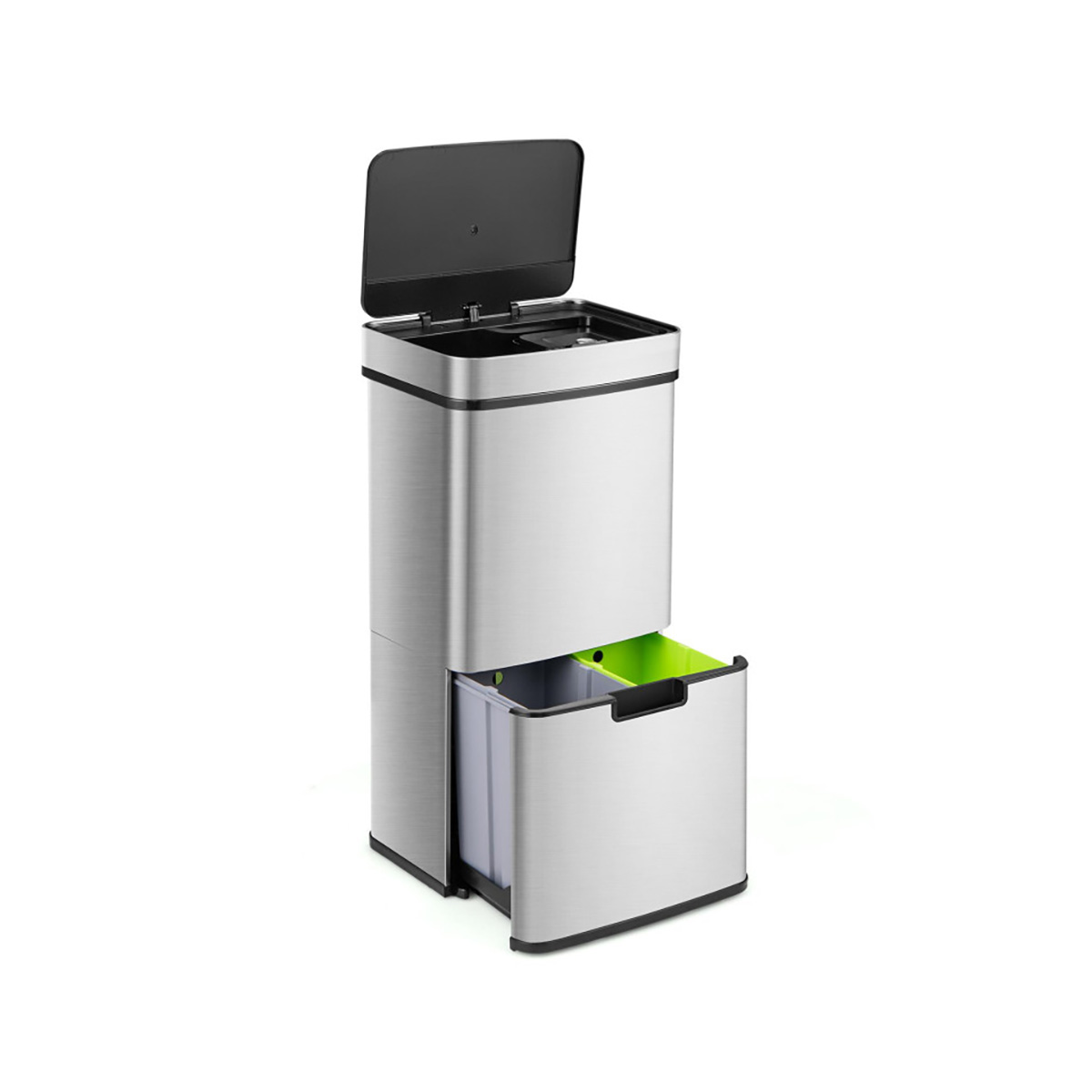 Advanced motion sensor opens lid in 0.3 seconds 19-gallon capacity with 4 compartments for waste sorting Includes 12-gallon upper bin, 1-gallon kitchen waste bin, and two 3-gallon recycling bins Stay-open feature with soft-closing lid for quiet operation Durable 3-layer stainless steel with anti-slip foot pads Requires 6 AA batteries (not included) 19 Gallon Quad Compartment Touchless Motion Sensor Trash Can