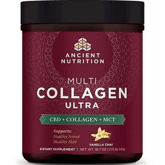 Combines 5 mg CBD in hemp extract with energizing medium chain triglycerides plus collagen for healthy skin & joints o Features US-grown hemp plus organic fermented herbs & botanicals o Includes collagen from four unique sources in a delicious vanilla chai flavor o o Ancient Nutrition Multi Collagen Ultra – Vanilla Chai Supplement Vitamin | 18.7 oz Powder o Sold by Swanson Vitamins