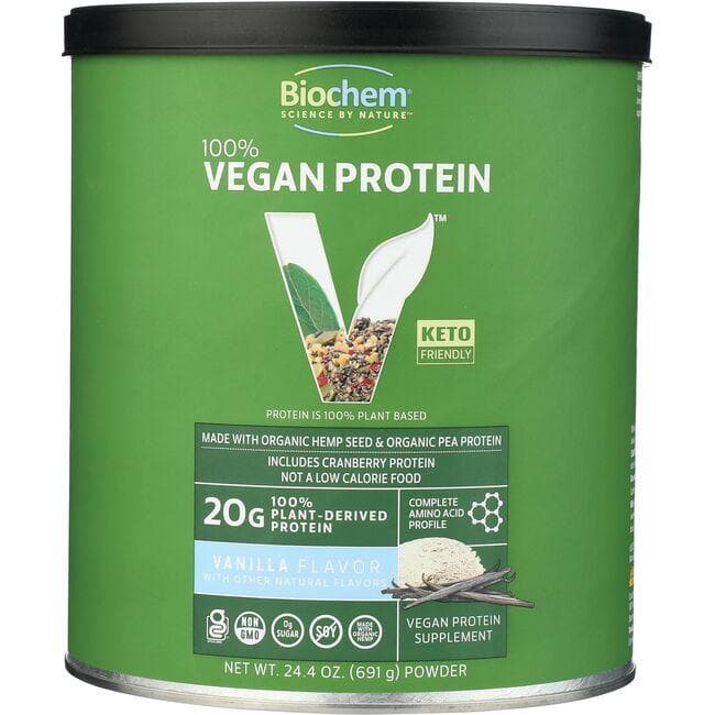 Plant-derived vegan protein formula o Made with organic hemp seed & pea protein o Complete amino acid profile o o Biochem 100% Vegan Protein – Vanilla | 26 G Protein 24.4 oz Powder o Sold by Swanson Vitamins