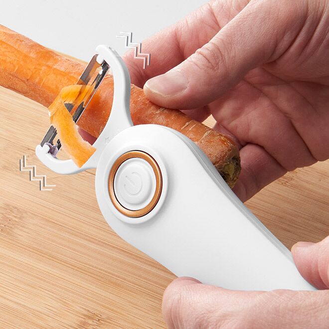 The Cordless Electric Veggie Peeler has a vibrating head to help you peel, slice and julienne a variety of fruits and vegetables, including carrots, potatoes, tomatoes, apples, pears, oranges, cucumbers, cabbage, beets, rutabaga, radishes, papaya and more. Includes 3 premium stainless steel blades for different functions.