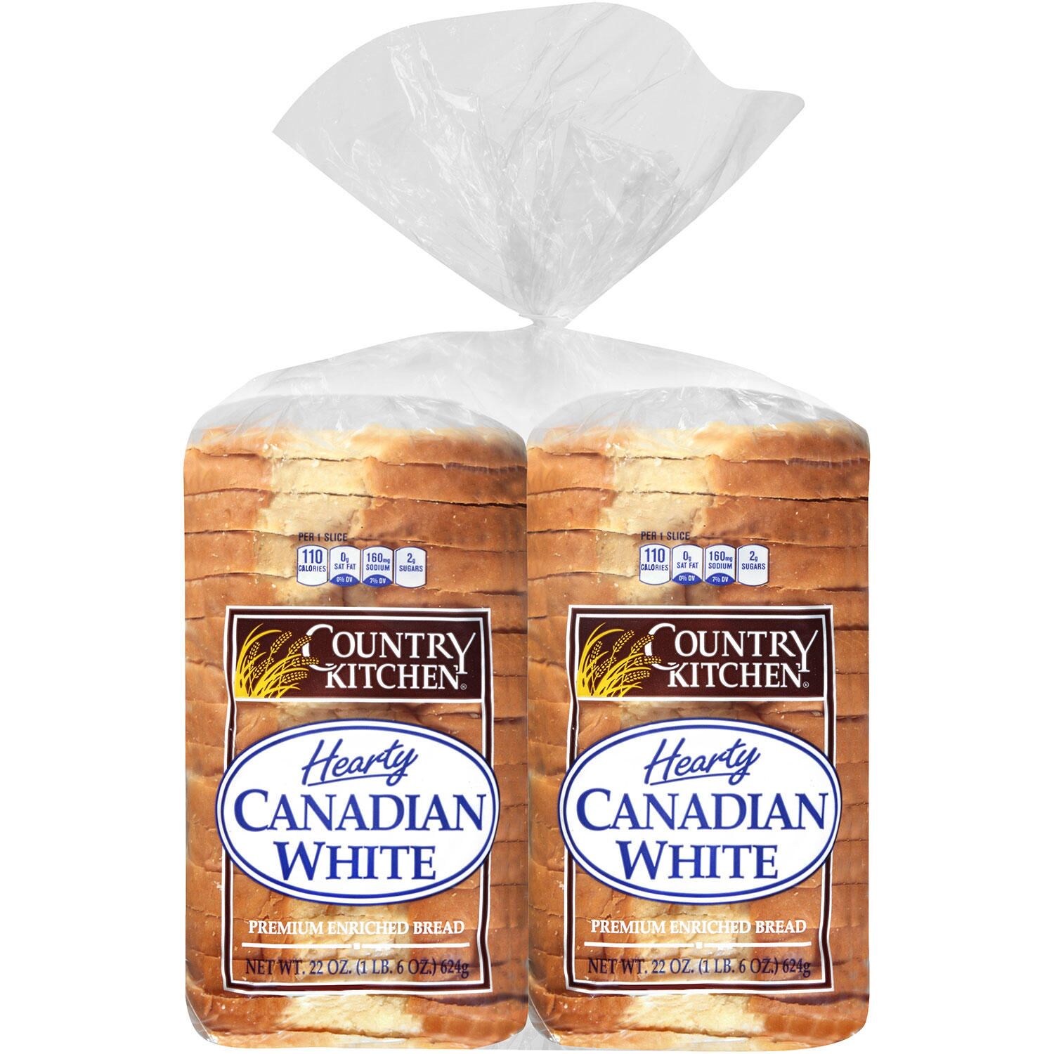 Rich goodness in a delicious, premium bread. We created Country Kitchen Canadian White to bring you a hearty, great tasting bread. We use honey and butter which have been staples for generations for making great bread. The finest ingredients deliver delicious slices. Stop now and order so you can take a slice and enjoy. Each of the 22 ounces loaves will generate enough slices for approximately 8 sandwiches, using two slices per sandwich. These slices are the standard specialty premium slice width of about 4.75″. Because of its mild flavor it goes well with peanut butter and jelly, ham and cheese, BLT’s or anything you can dream up. Slice, season, toast to make croutons. Slice, toast, crumble to make breadcrumbs. Cube and toast to add to your favorite stuffing recipe. Of course, you can add whatever seasonings your heart desires to any of these ideas.Sandwiches that start with Country Kitchen Hearty Canadian White bread can’t help but be delicious. Make sure you select this soft and delicious Country Kitchen bread the next time you need to stock the pantry. You and your family will enjoy Country Kitchen’s goodness because it is baked with quality ingredients.Bread retains its best quality if stored at room temperature. For best results use bread by date on package. We are committed to providing you with the highest quality baked foods.