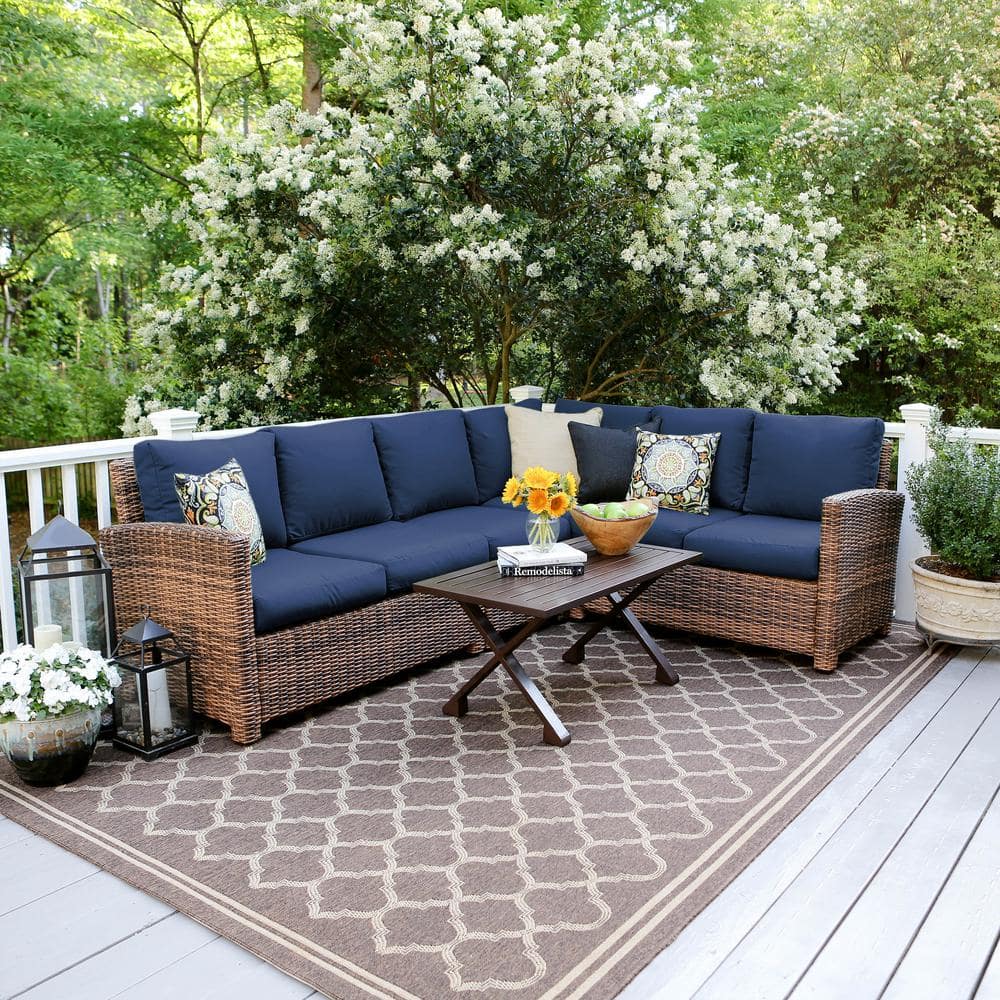 Comfortable and built for the outdoors, the Dalton Sectional adds stylish seating to your outdoor space. The hand-woven resin wicker is modeled in light and dark brown tones, lending a casual vibe to this outdoor seating set. The extra armless seat can be moved from right to left, depending on your needs. The coffee table is made of rust-proof aluminum painted in a faux woodgrain finish. Cushions are a generous 22″ wide and 4.5″ thick, constructed with a soft top layer wrapped around a high density foam core. The sectional includes zippered cushion covers made with 100% solution dyed outdoor polyester. One year limited warranty. Dalton includes: a left and a right arm loveseat, an armless seat, a corner seat, and a coffee table. Throw pillows and decorative accessories are not included.