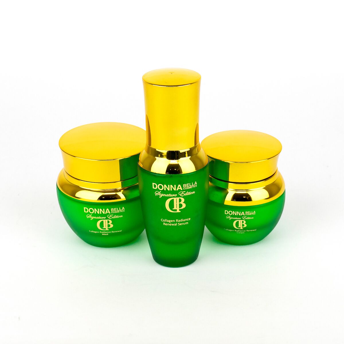 Includes Collagen Renewal Cream, Mask, and Serum Collagen fights wrinkles and improves elasticity Brightens skin tone and minimizes hyper-pigmentation Enhances hydration and moisture retention Infused with 24K Nano Gold for radiance and firmness Donna Bella’s Signature Edition Collagen Radiance Renewal Set
