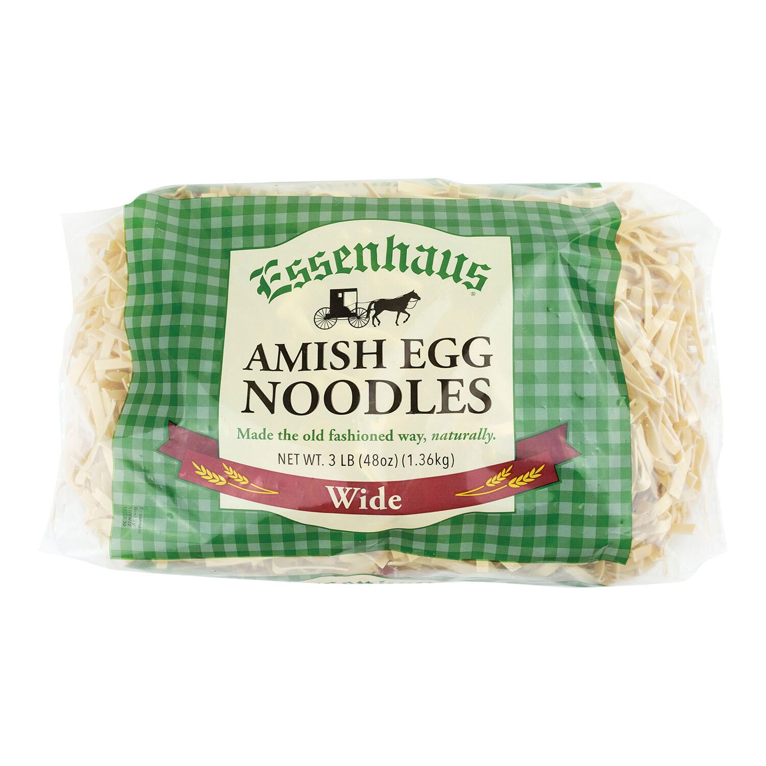 What is Essenhaus?In 1971 Das Dutchman Essenhaus opened as an Amish-style restaurant in Middlebury, Indiana and is now the largest family-owned restaurant in the state. In addition to the restaurant, the campus is also home to a bakery, Inn & Conference Center, Heritage Hall, and several unique gift shops. Essenhaus products are prepared the old-fashioned way, using genuine Amish recipes passed down through the generations. From our Amish Country Kitchen to your table, we are pleased to offer the same time-honored recipes we have proudly served for 50 years.Amish Noodles – how they’re madeOur Amish Egg Noodles are prepared the same way Grandma made them. We mix flour, eggs, and water into a rich dough; then we roll it into a sheet. The sheet is cut, dried, and packaged. This process creates a superior noodle when compared to extruded brands. Essenhaus noodles are stronger, heartier, and hold flavor better than any other noodle in stores. We stand by our products and the same noodle on the shelf is what we use in our own Amish Country Kitchen.What can you make with Amish Noodles?In short, anything! Essenhaus Amish Egg Noodles can be used in any dish you would normally make with pasta. Our noodles go especially well with soups, where they can soak up that delicious broth flavor. You can add these noodles to meat dishes such as a beef stroganoff or use them to enhance a side dish such as chicken gravy.