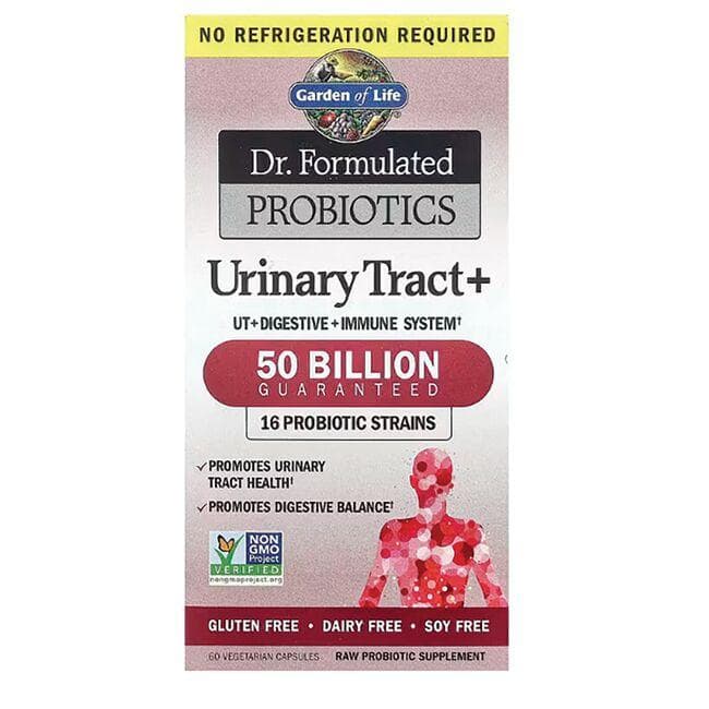Probiotic formula supports digestive, immune and urinary tract health o 50 billion probiotic organisms per serving o No refrigeration required o Vegetarian capsules o o Garden of Life Dr. Formulated Probiotics Urinary Tract+ Supplement Vitamin | 50 Billion CFU | 60 Veg Caps o Sold by Swanson Vitamins