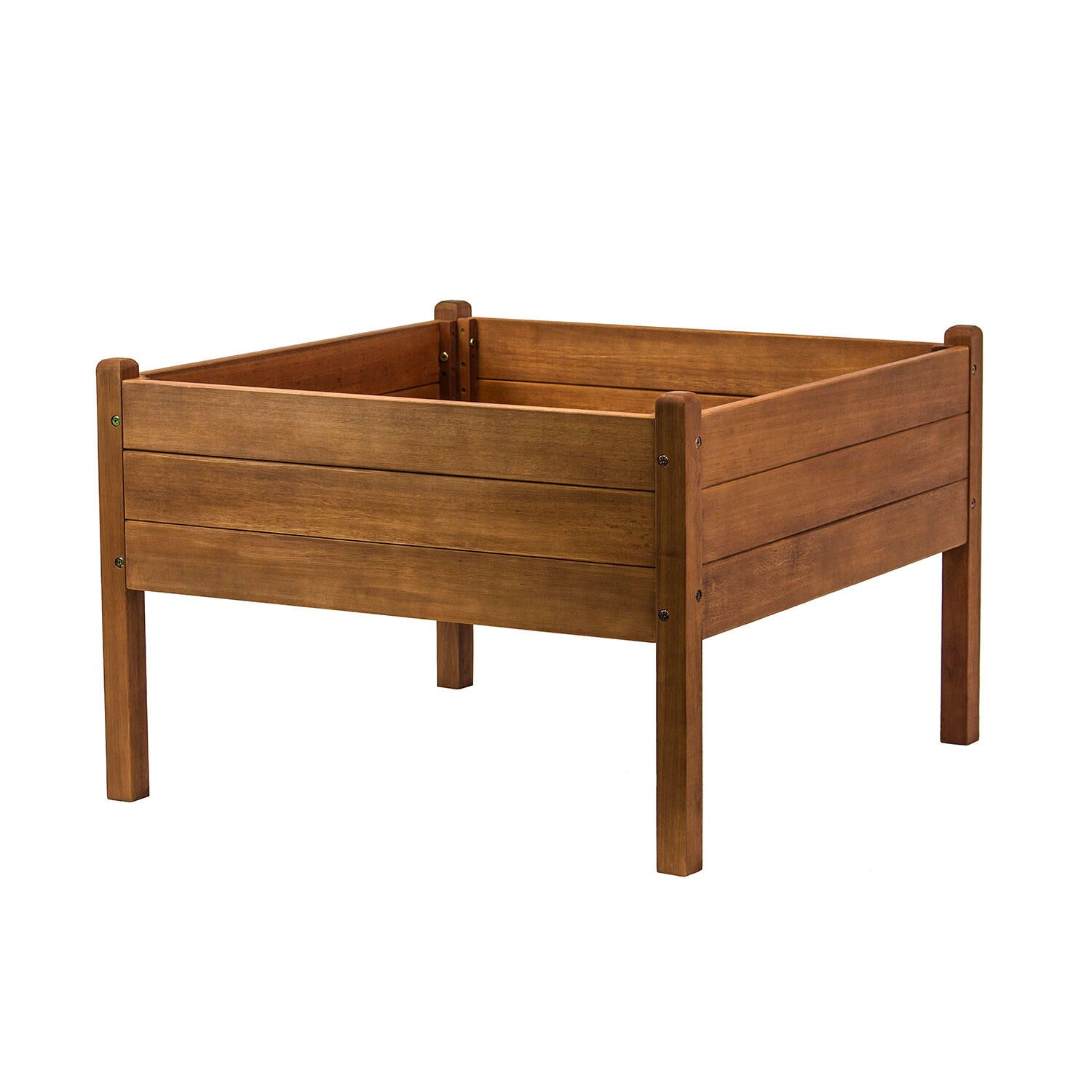 Good Ideas Garden Wizard Eucalyptus Garden Bed is a simple and elegant solution for any outdoor need. With a warm, red stain, this bed is designed to be attractive and soft on the hands yet durable enough to hold up under stressful conditions. Crafted of solid eucalyptus wood, you can trust this natural, renewable resource that will last for years against harsh environments. How High off the Ground is this Garden Bed? This bed sits two feet off the ground, allowing better access than regular ground-based gardens. The high wall design deters the most common rodents and other wildlife. Assembly is easy due to the limited number of components and takes only minutes to complete. The Eucalyptus garden bed can be placed in the yard, on a deck or patio. Plant a vegetable garden or create a beautiful floral setting with several beds. Garden fabric is recommended but not included.