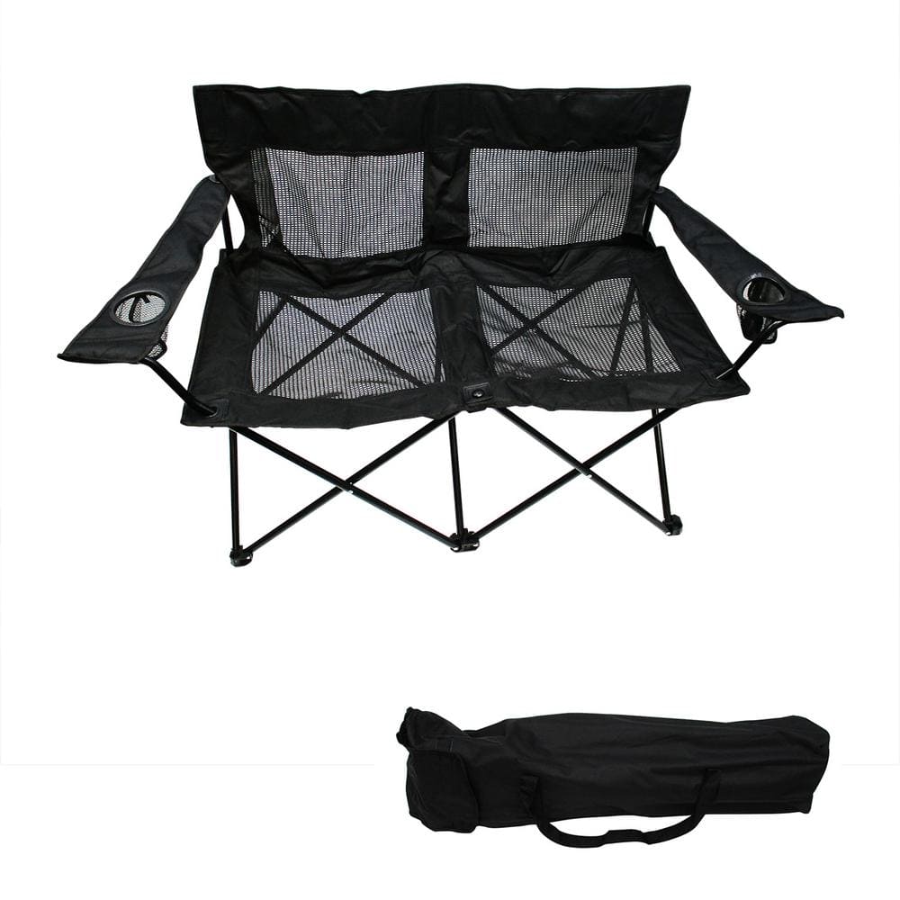 This steel frame double camp chair is the perfect seat for cozying up to the camp fire with that special someone. Comfortably seating two adults, the easy set up makes it the perfect seating option for your favorite sporting event or camping trip. Steel frame measures 40 in. L x 22 in. W x 31.5 in. overall height with a 440 lbs. weight capacity. Mesh fabric seat and back provides extra ventilation and the entire seat folds for easy storage. By Trademark Innovations. Color: Black Mesh.