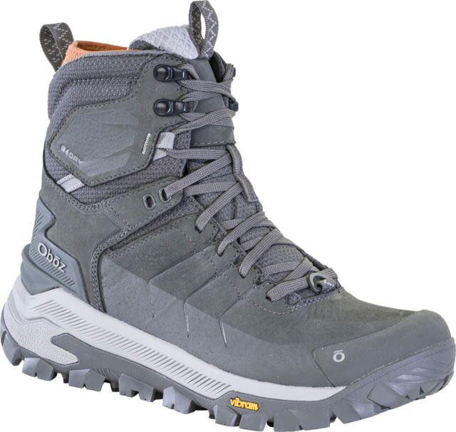 Oboz Bangtail Mid Insulated B-DRY Winter Boots – Men’s Medium Charcoal 10 US. Whether your plan is to hike the Bangtail Divide Trail or snowshoe in your backyard this winter boot has you covered. Specifications for Oboz Bangtail Mid Insulated B-DRY Winter Boots – Men’s: Manufacturer: Oboz Gender: Male Age Group: Adults Men’s Shoe Width: Medium Shoe Height: Mid Boot Style: Winter Boots Color: Charcoal Activity: Casual Outdoor Weight: 21.1 oz Seasonal/Temperature Use: Winter Footwear Upper Fabric/Material: Nubuck Leather Water Resistance Level: Waterproof Lining Material: B-DRY Midsole Material: Freeze Guard Heel Drop: 8 mm Features of Oboz Bangtail Mid Insulated B-DRY Winter Boots – Men’s VIBRAM Arctic Grip innovative technology specifically engineered and designed to perform on wet ice Freeze Guard Insulation keeps feet feeling great. 100percent post consumer recycled polyester feels pretty good too Engineered for lightweight stability and comfort our proprietary ACT+ cushioning system enhances our base ACT compression molded EVA foam by infusing it with performance properties that provides a ride that is both efficient and stable Improved B-DRY lining adds increased waterproofness and breathability and uses recycled materials 100percent recycled polyester laces and webbing and quick drying 100percent recycling polyester lining and 50percent recycled waterproof lining help us lighten Oboze impact on the planet Package Contents: Oboz Bangtail Mid Insulated B-DRY Winter Boots – Men’s Oboz 83501-102-10-Medium: Bangtail Mid Insulated B-DRY Winter Boots – Men’s Medium Charcoal 10 US