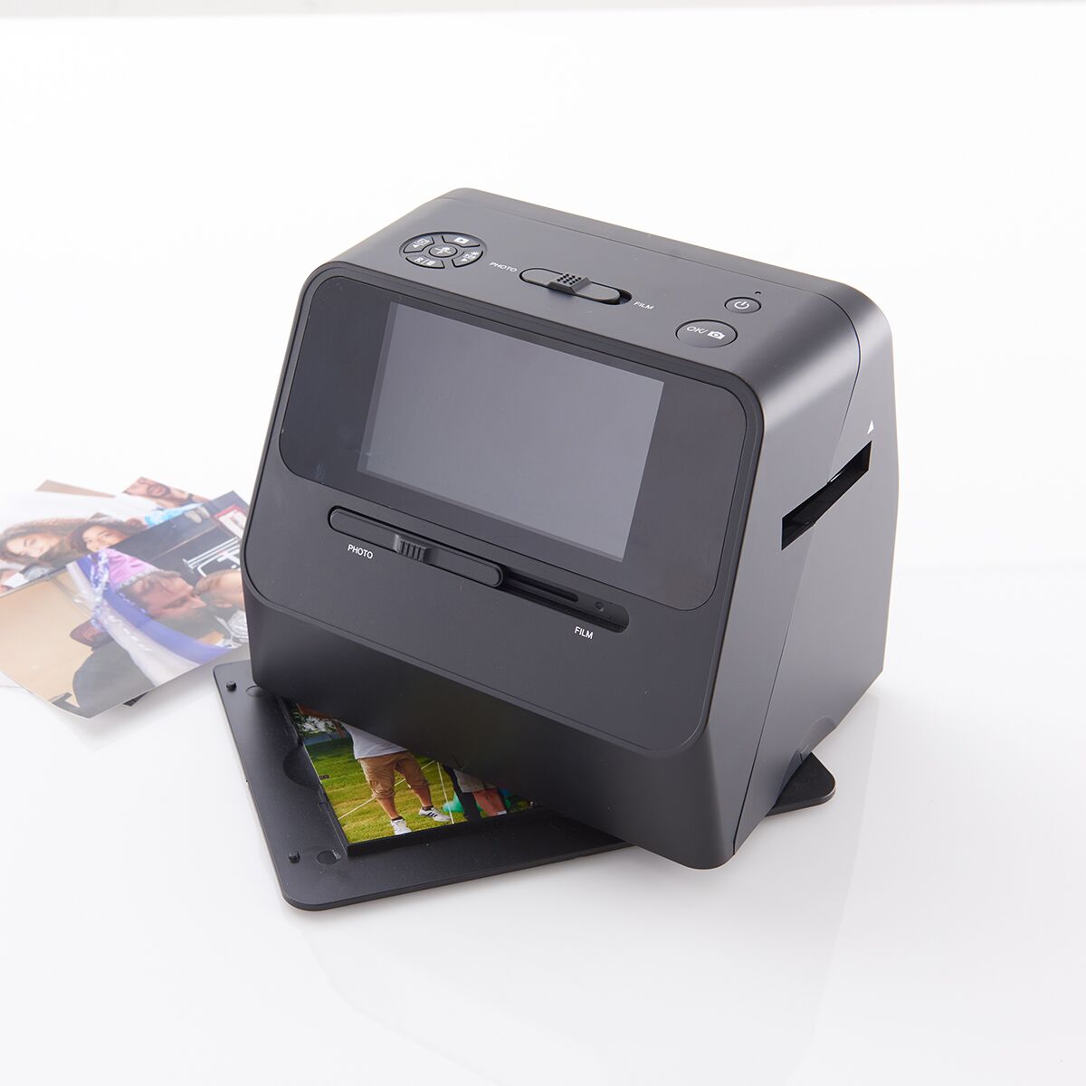 Scans photos, slides, and 35mm negatives Digitizes images without removing them from albums 14 MP and 22 MP resolution options 5” color screen for easy viewing Stores images directly onto a memory card Rapid Photo Album Scanner by Sharper Image