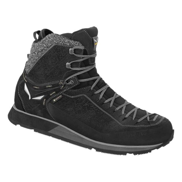 Salewa MTN Trainer 2 Winter GTX Hiking Shoes – Men’s Black/Black 12. It blends mountain tradition with Salewa’s innovative proprietary technologies. Suede & GORE-TEX construction The high-quality 1.4mm suede and robust fabric upper has a GORE-TEX Performance Comfort membrane that is designed to provide waterproofing and optimised climate comfort in changing weather conditions and a wide range of activities. It protects your feet from rain snow and slush while allowing sweat in the form of water vapour to easily escape to the outside. Its four-layer laminate construction also offers a moderate level of additional insulation. The Salewa 3F System protects and wraps the foot for flexibility fit and support and there is a full protective rubber rand and a stretch gaiter to keep out trail debris. Winter comfort For further winter comfort the AlpineWool Flex Collar increases the range of motion of the ankle and insulates blood flow at the ankle and heel area. Artic Grip Underfoot the state-of-the-art Vibram Icetrek II sole with Artic Grip technology has wider lugs and a winter optimised rubber compound that offers unparalleled grip and performance in difficult conditions like snowy surfaces and slippery wet ice. This is the most advanced cold weather grip technology Vibram has ever created. A versatile hiking boot that will keep your feet dry and thermoregulated in winter conditions. Specifications for Salewa MTN Trainer 2 Winter GTX Hiking Shoes – Men’s: Manufacturer: Salewa Gender: Male Age Group: Adults Men’s Shoe Width: Medium Boot Style: Hiking Shoes Footwear Type: Shoes Activity: Hiking Weight: 627 g Footwear Closure: Laces Footwear Upper Fabric/Material: Full rubber rand AlpineWool heel collar Stretch fabric Suede 14 mm Activity/Occasion: Climbing Hiking Insole Material: Mid stiff Nylon Lining Material: GORE-TEX Koala/Panda Midsole Material: Microporose Outsole Material: VIBRAM ICETREK II Artic Grip Condition: New Features of Salewa MTN Trainer 2 Winter GTX Hiking Shoes – Men’s Upper: 360 full rubber rand Suede 14 mm AlpineWool heel collar 3F System with Kevlar Cables Lining: GORE-TEX Performance Comfort Microporose Outsole: VIBRAM ICETREK II Artic Grip Responsive Footbed Package Contents: Salewa MTN Trainer 2 Winter GTX Hiking Shoes – Men’s Salewa 00-0000061372-971-12: MTN Trainer 2 Winter GTX Hiking Shoes – Men’s Black/Black 12