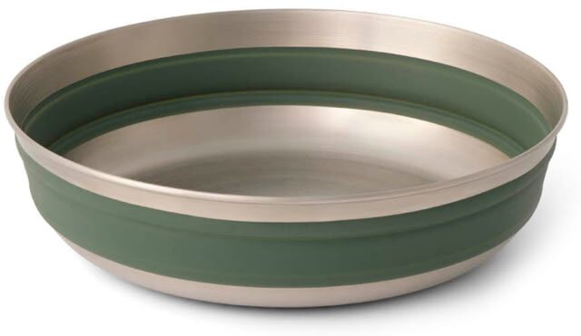 Sea to Summit Detour Stainless Steel Collapsible Bowl Laurel Wreath Green Large. The innovative design allows the bowl to pack down to 21mm (3/4in) in height for storage or expand to a full size bowl at meal time. The inside curve between the base and sidewalls perfectly matches Sea to Summit spoons so you can enjoy every last morsel and easy cleanup. The silicone rubber insert on the base prevents your bowl from slipping on tables or shelving and delivers a rattle-free storage. Elevate your meal time experience. Specifications for Sea to Summit Detour Stainless Steel Collapsible Bowl: Manufacturer: Sea to Summit Quantity: 1 Fabric/Material: Stainless Steel Silicone Rubber Features of Sea to Summit Detour Stainless Steel Collapsible Bowl Crafted with EU food-grade silicone rubber and durable stainless steel for the strongest collapsible bowl ever Innovative design enables the kettle to collapse down to 21mm (3/4in) tall for storage or expand to a full-function bowl. Components are BPA-free and certified to EU food-grade standards Curve between the base and sidewalls perfectly matches Sea to Summit spoons so you can enjoy every last morsel and easy cleanup Designed to stack once collapsed the silicone rubber insert in the base means the bowls will not slide or rattle during transport Generous capacity for greater usage and larger servings (665ml or 915ml)(22 fl oz or 30 fl oz) Sea to Summit Guarantee is offered for the Lifetime of this product Package Contents: Sea to Summit Detour Stainless Steel Collapsible Bowl Sea to Summit A1323-40: Detour Stainless Steel Collapsible Bowl Laurel Wreath Green Large