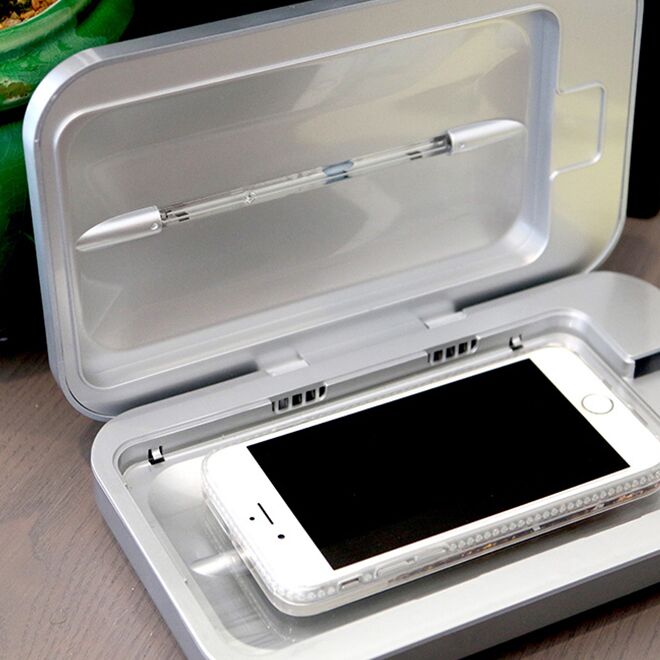 NOW COMPATIBLE WITH ALL SMARTPHONES, INCLUDING: iPhone 10 XS, Galaxy A9s, and Pixel 3! The Smartphone UV Sanitizer and Charger is the first and only device that sanitizes and charges your phone simultaneously. Two Ultraviolet-C lamps eliminate up to 99.9% of bacteria on your phone’s surface in just 10 minutes! Accommodates all phones measuring 6.8″ L x 3.74″ W x.78″ H or smaller. Available in Black or White. Smartphone UV Sanitizer And Charger – White
