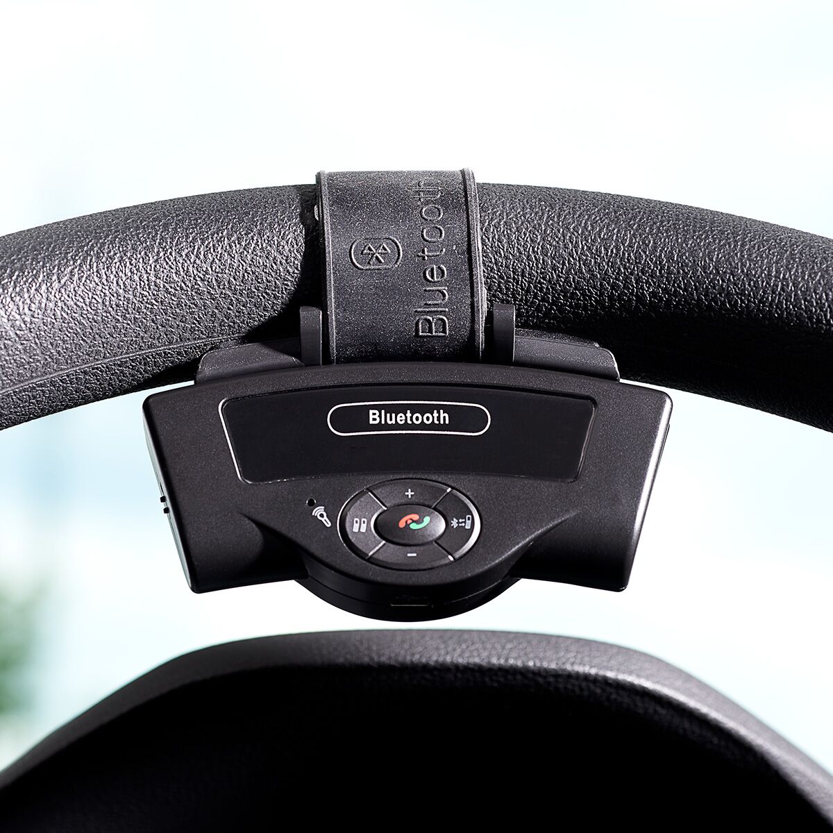 The rechargeable Steering Wheel Bluetooth Speakerphone lets you enjoy hands-free phone calls in any vehicle. Simply strap it to your steering wheel and pair it with 1 or 2 smartphones via Bluetooth. Compatible with all iPhones and Galaxy/Android phones. Includes car charger with dual USB ports.