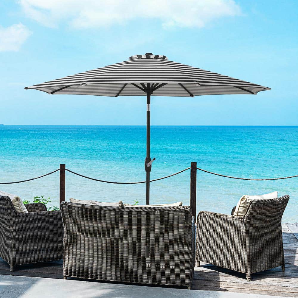 Enjoy the sunshine and scenery while keeping cool with this 9 ft. steel Outdoor Patio Table Umbrella. Designed with style and durability in mind, this piece is built with an steel frame that’s resistant to rust. The polyester fabric blocks up to 95% of UV rays to keep yourself while being fade resistant and waterproof.