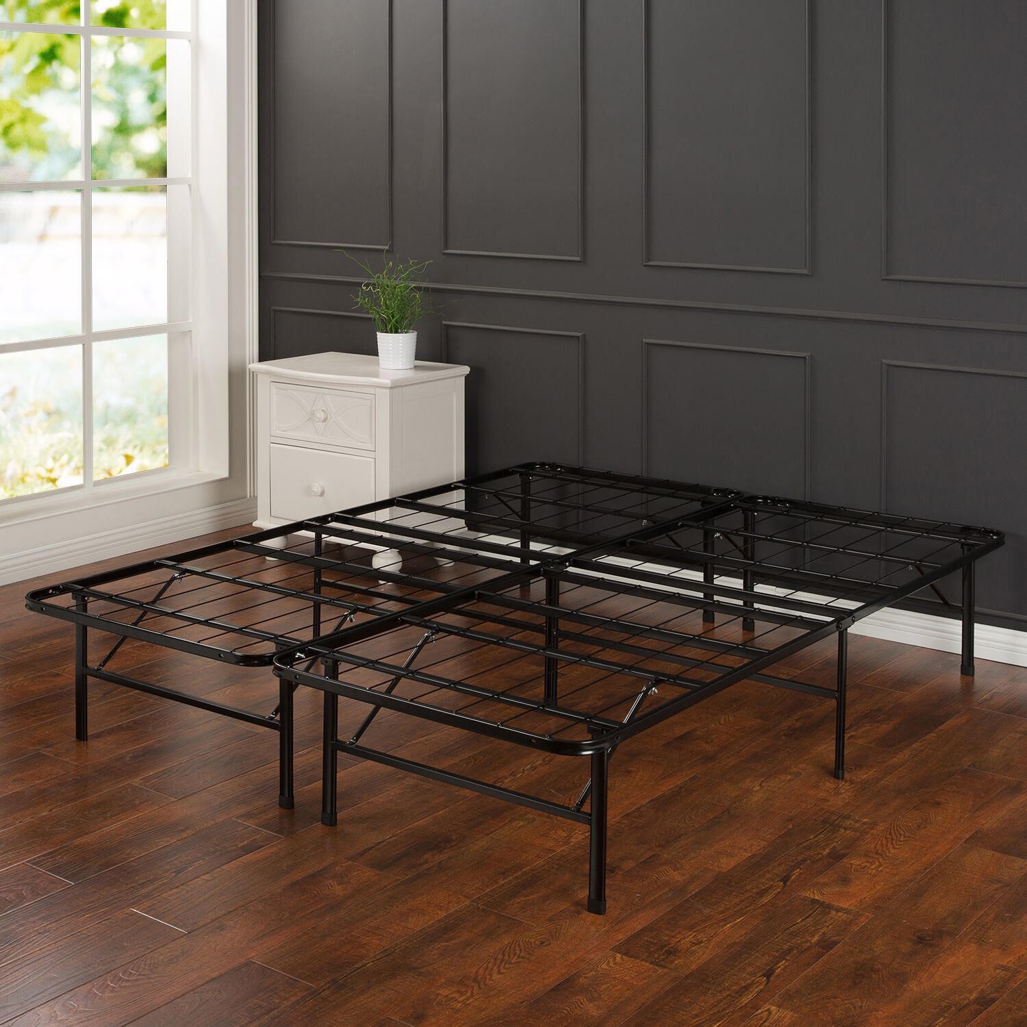 The Next Generation Bed Frame-The Night Therapy SmartBaseĀ® Mattress Foundation by Zinus comes with four headboard/footboard brackets to allow headboard and footboard attachment to your frame and a white bed skirt. The SmartBaseĀ® eliminates the need for a box spring as your memory foam, spring or latex mattress should be placed directly on the SmartBaseĀ®. Uniquely designed for optimum support and durability the strong steel mattress support has multiple points of contact with the floor for stability and prevents mattress sagging, increasing mattress life.The SmartBaseĀ® bed frame is 14 inches high with 12.5 inches of clearance under the frame for valuable under-bed storage space. With plastic caps to protect your floors and an innovative folding design to allow for easy storage, the SmartBaseĀ® is well designed for ease of use. Worry-free 5-year limited warranty. Another comfort innovation from Zinus. Pioneering comfort.